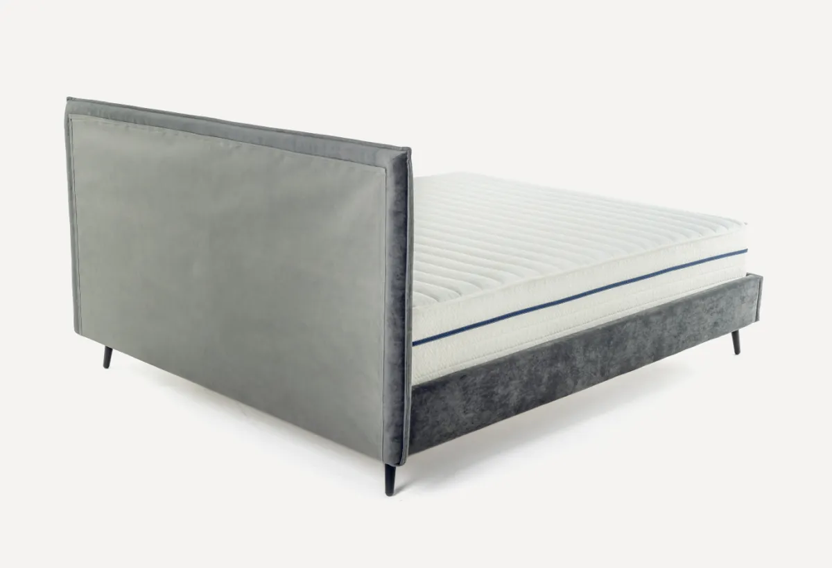 Кровать в стиле лофт сочетает в себе изящный и современный дизайн с высокими металлическими опорами, которые придают ей индустриальный вид. Высокое изголовье с выраженным плоским кантом добавляет элегантности и стиля, а центральная вертикальная утяжка подчёркивает удобство и функциональность. Ножки имеют тонкий и изящный дизайн, что также соответствует минималистичному стилю.